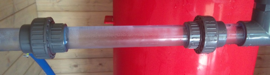 Po napowietrzeniu woda trafia do zbiornika wodnopowietrznego (aeratora/ hydroforu), gdzie następuje reakcja utleniania i wytrącania osadów żelaza. Skuteczność wytrącania jest tym większa, im dłuższy jest czas, jaki woda spędza w zbiorniku (zalecany 2 – 3 min). Oznacza to, że na każdy 1 m3 przepływającej wody potrzeba 35 – 50 l pojemności czynnej zbiornika. Zbyt mały zbiornik powoduje, że do filtrów trafi więcej żelaza w formie rozpuszczalnej – wytrąci się ono dopiero w filtrach, przez co muszą być one odpowiednio wyższe (jeśli będą za niskie, żelazo wytrącać się będzie za filtrami).