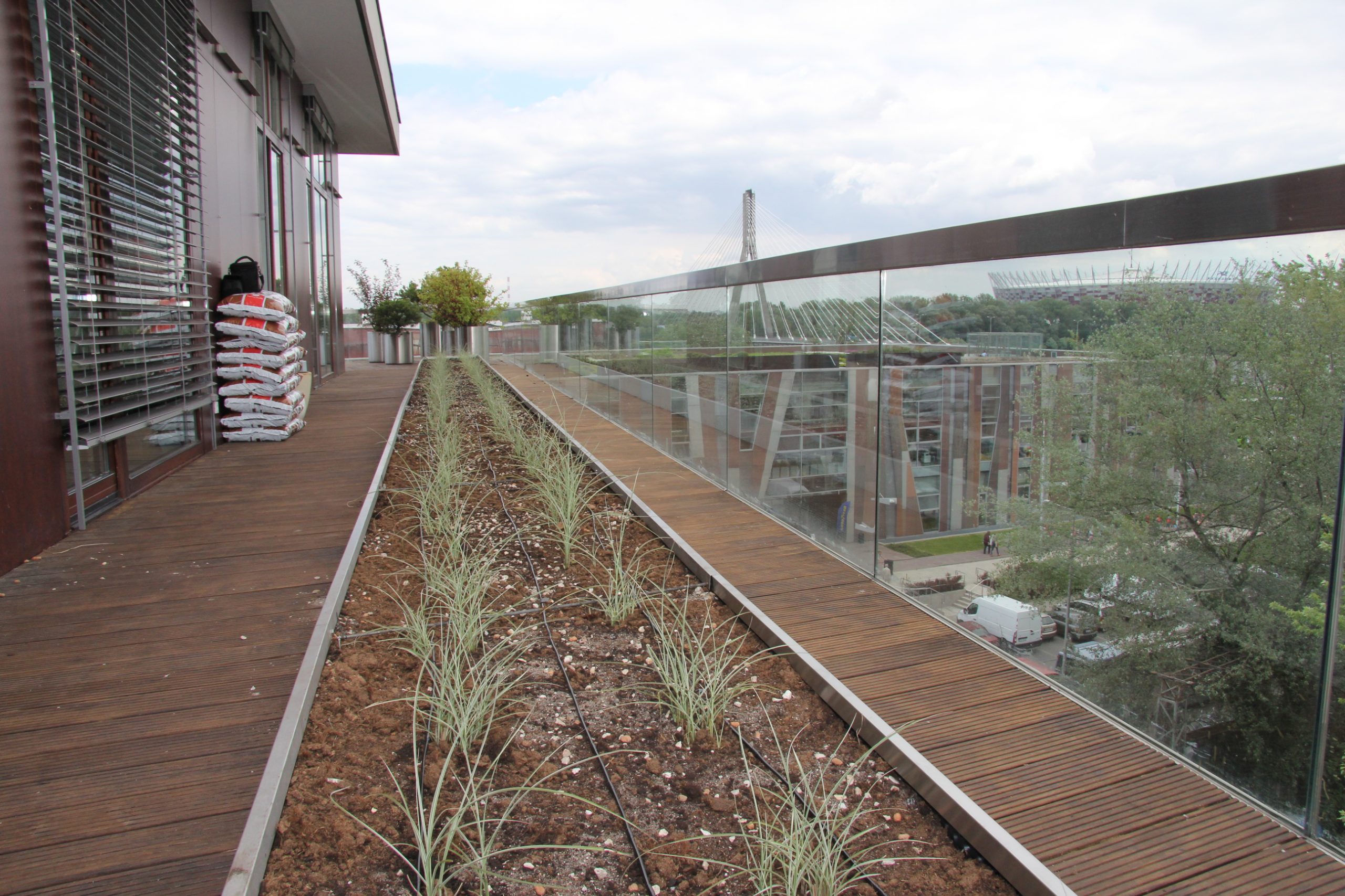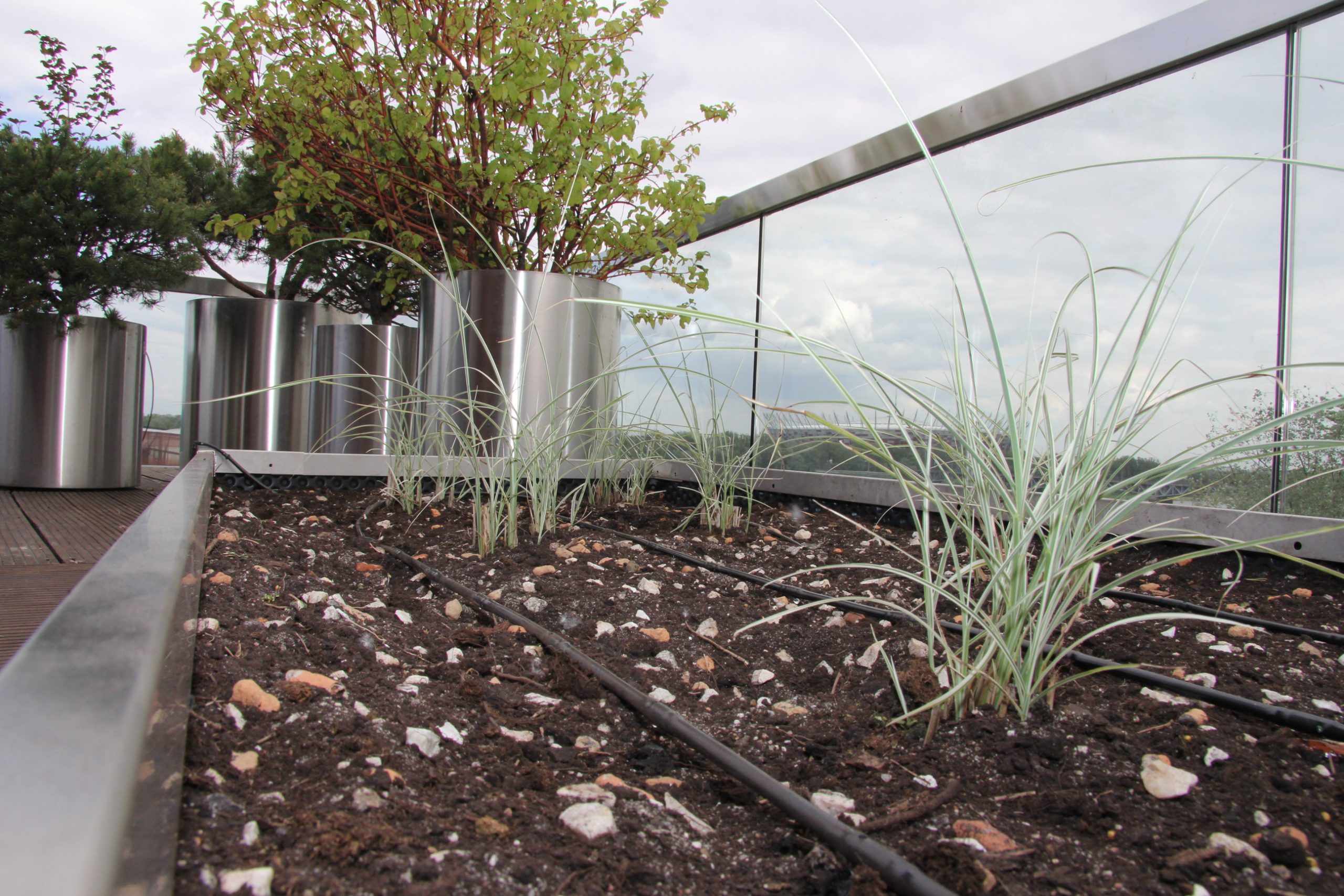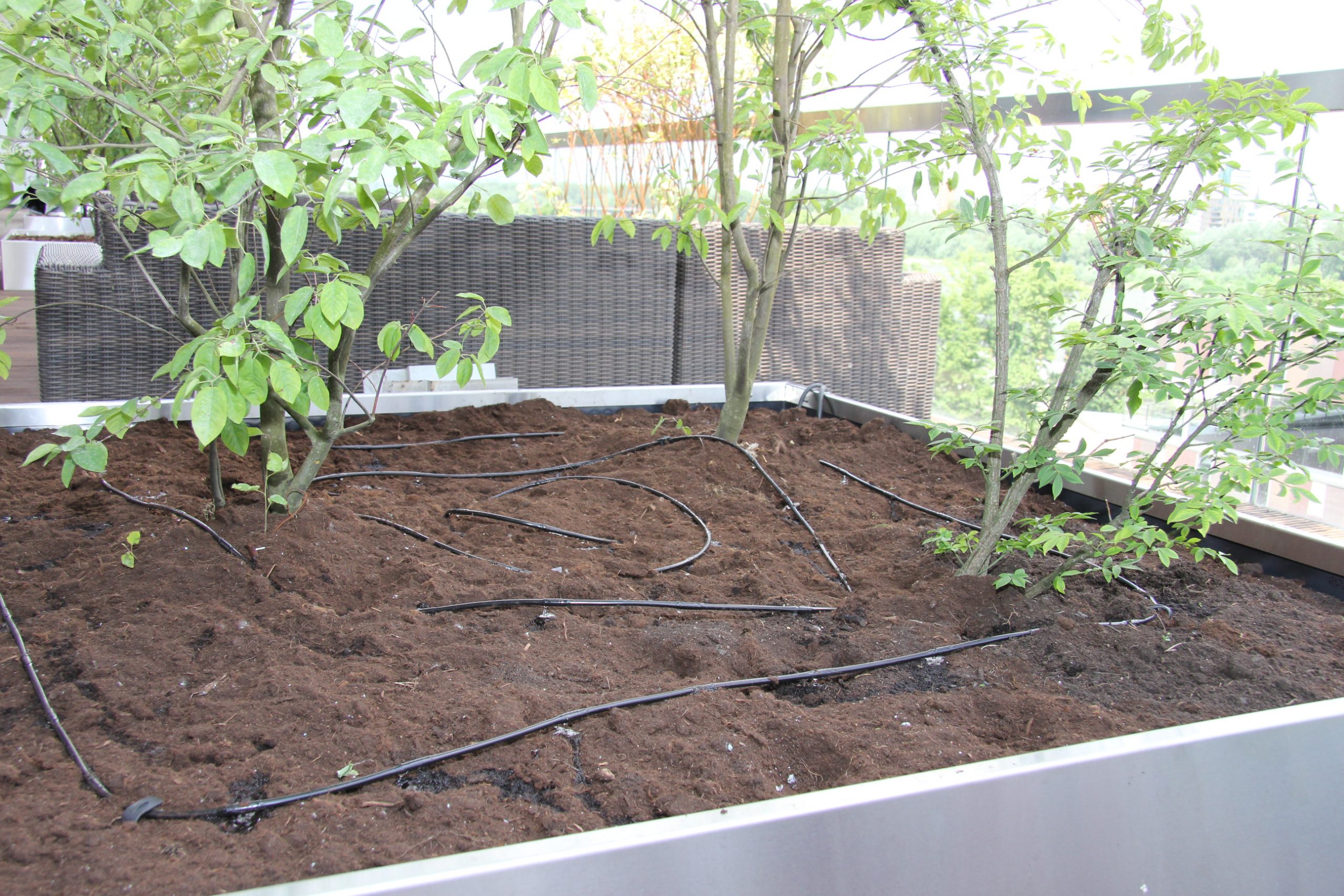 W celu zapewnienia zieleni prawidłowego wzrostu, należało zaprojektować system nawadniania doniczek, który rozwiązywałby dwie kłopotliwe przy tej realizacji kwestie. Problematyczne okazały się przeznaczone do nasadzeń donice, niektóre niewielkich rozmiarów (trudne do równomiernego nawodnienia i dostarczenia wody na całej jej powierzchni), niezdolne pomieścić większość dostępnych na rynku produktów do nawadniania roślin. Problematyczna okazała się także lokalizacja tarasu o stałej ekspozycji na światło słoneczne, szczególnie w sezonie letnim. W takich warunkach dla optymalnego wzrostu roślinności bezwzględnie potrzebne jest regularne nawadnianie.