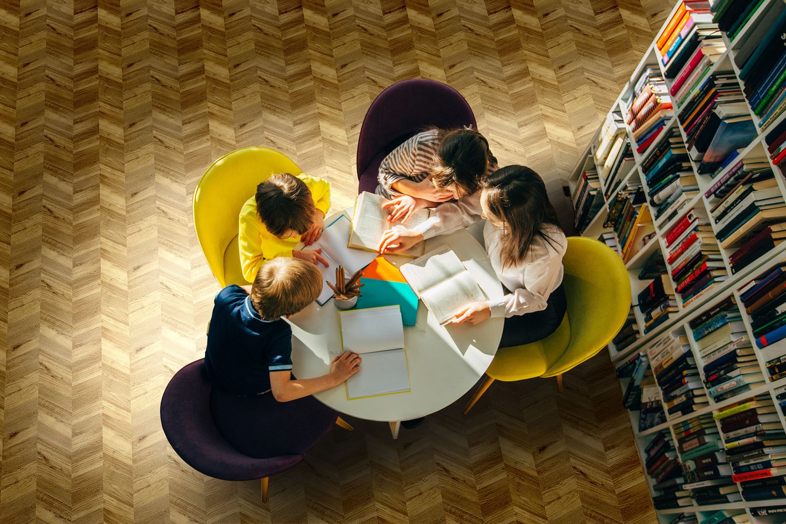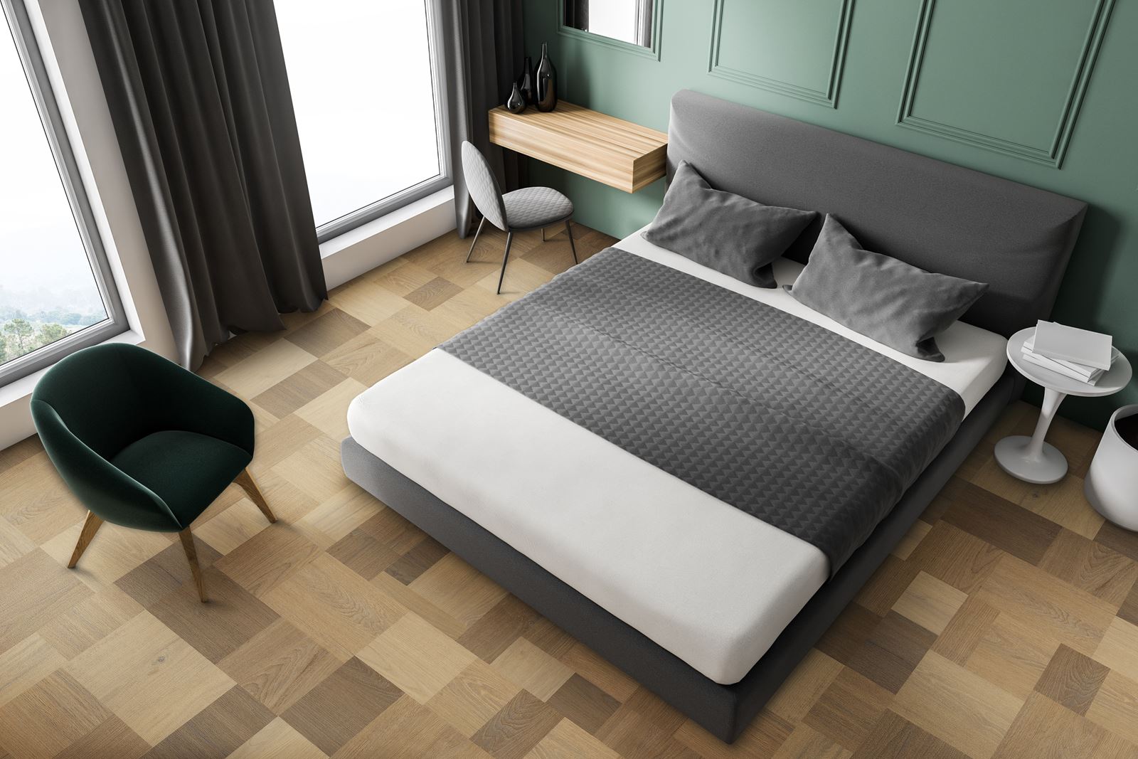 Podłogi wykończone wzorzystymi motywami mogą wydawać się dominujące i przytłaczające. Wzór może osaczać i sprawiać że pomieszczenie wydaje się małe. Najprostszym rozwiązaniem, jest wykorzystanie materiałów o dużych gabarytach. Wykładzina Novoflor Extra Mars z wzorem w jodełkę, dostępna jest w 2-metrowych rolkach. Pozwala to na uzyskanie jednolitych, niemalże bezspoinowych powierzchni. Duże formaty sprawiają, że zaaranżowana przestrzeń jest optycznie większa, wyższa i bardziej spójna.