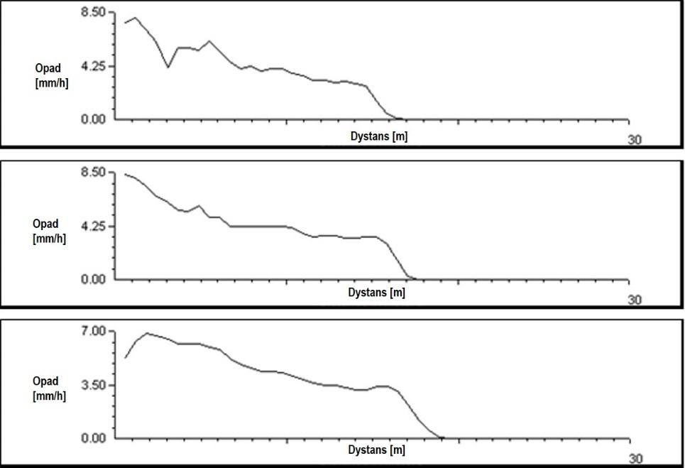 - na skraju zasięgu, na długości ostatnich 1,5-2m, wartość opadu jest znikoma (<3mm/h), a przez to wrażliwa na podmuchy wiatru.