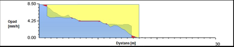 Widoczne jest, że przy założonej odległości 0,6R, na całej długości występują nierównomierności w wysokości opadu (pola czerwone). Efektem takiego rozstawu zraszaczy będą przesuszone lub przelane obszary.
